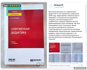 Великолепная книга по современной дидактике от А.В. Хуторского, изданная в 2025 году, представляет собой не просто перепринт, а актуальное исследование текущего состояния дидактики и современных трендов. Издание прошло рецензирование таких экспертов, как Ш.А. Амонашвили и В.А. Сластенин. Автор мастерски преподносит материал, структурируя его с акцентом на ключевые определения. Книга включает теоретические разделы, практические задания и, что особенно важно, контрольные вопросы и рекомендованную литературу. Рекомендую к покупке! - Наталья М.